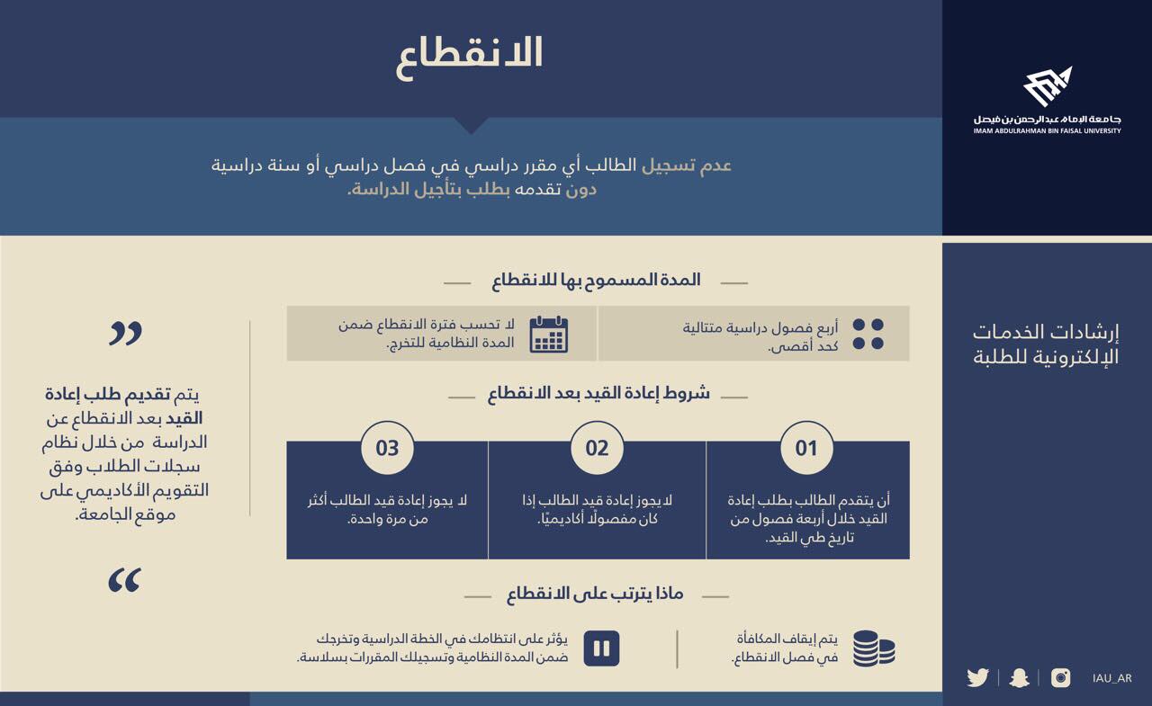 عمادة القبول والتسجيل On Twitter الانقطاع عن الدراسة المدة المسموح بها للانقطاع شروط اعادة القيد بعد الانقطاع ماذا يترتب عليه كيف يمكن تقديم طلب اعادة القيد بعد الانقطاع جامعة الإمام عبدالرحمن بن فيصل مبادرة وعي Https T Co Iaxmqneuxs