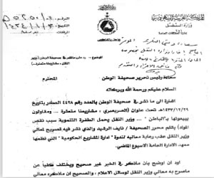 وزارة النقل تعترض بخطاب إيضاحي و الوطن تنشر تصريح الصريصري حرفيا جريدة الوطن