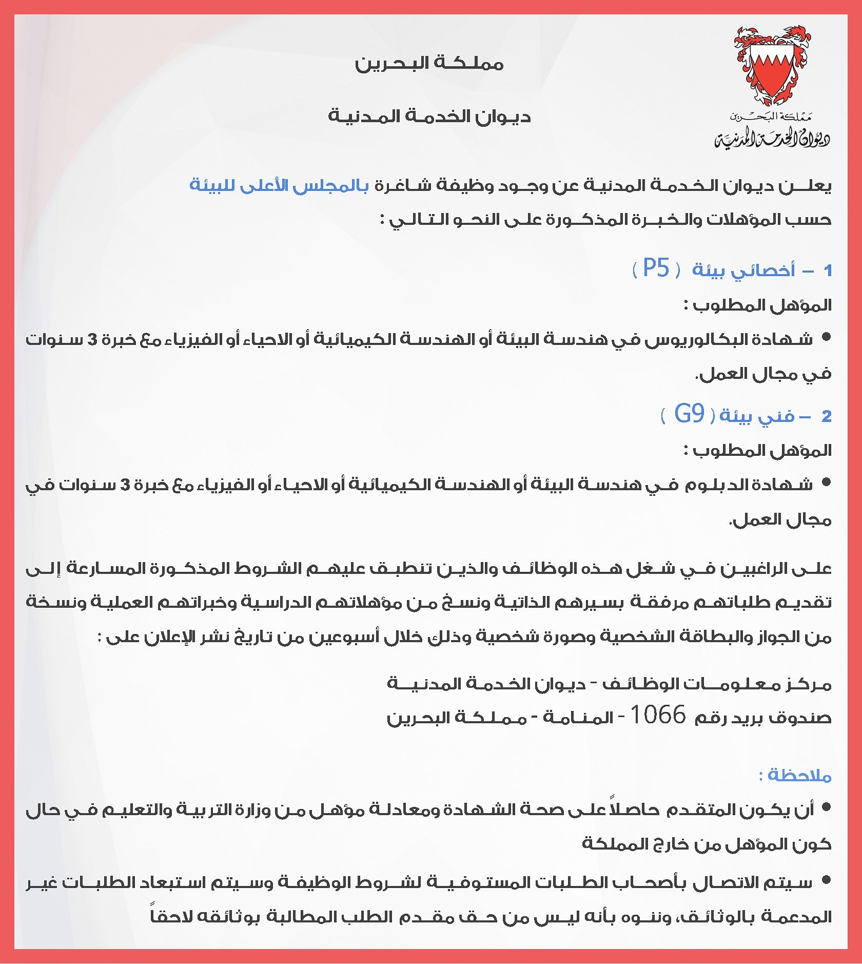 Civil Service Bureau On Twitter يعلن ديوان الخدمة المدنية عن وجود وظائف شاغرة بالمجلس الأعلى للبيئة حسب التالي Bahrain Csb البحرين