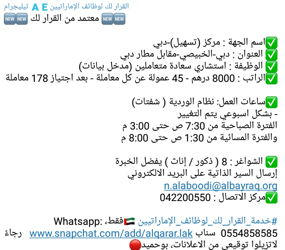 وظائف في مركز تسهيل دبي براتب ٨ الاف درهم وعمولة غير محدد الجنسيات
