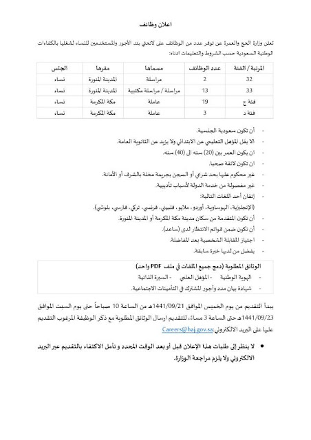 بدء تقديم وظائف وزارة الحج والعمرة للنساء علي بند الاجور لحملة الثانوية وظائف نسائية 1441