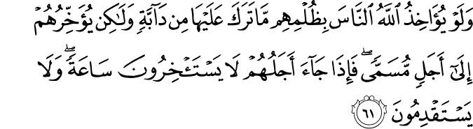 و ل و ي ؤ اخ ذ الل ه الن اس ب ظ ل م ه م م ا ت ر ك ع ل ي ه ا م ن د اب ة و ل ك ن ي ؤ خ ر ه م إ ل ى أ ج ل م س م ى ف إ ذ ا ج اء أ ج ل ه م ل ا ي س ت أ خ ر ون س اع ة و ل ا ي س ت ق د م ون تفسير الجلالين النحل 61