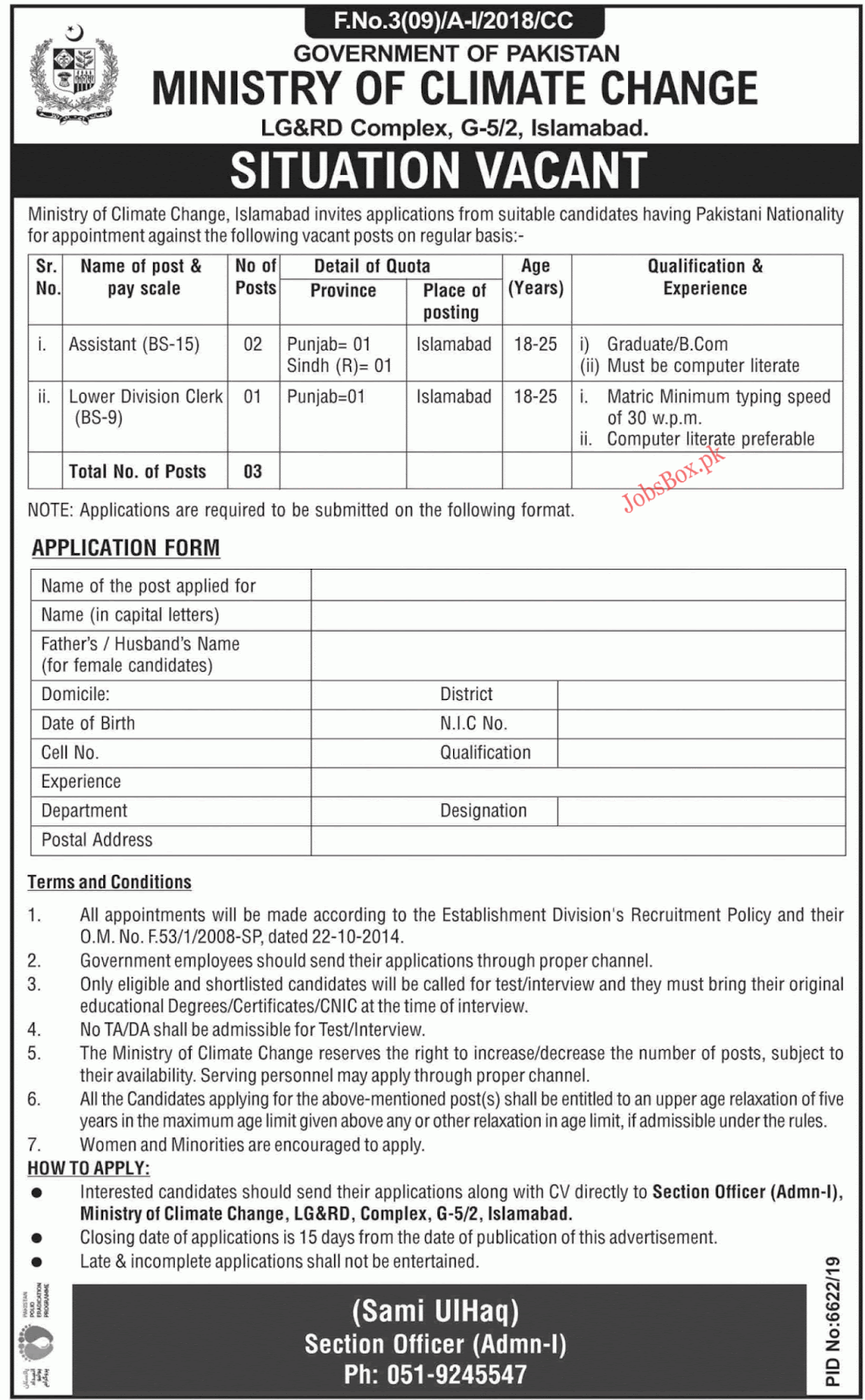 Ministry Of Climate Change Ots Jobs 2020 Download Application Form